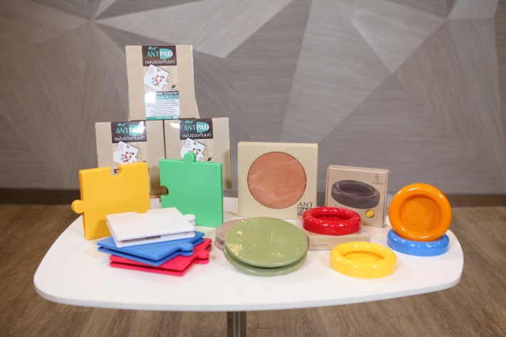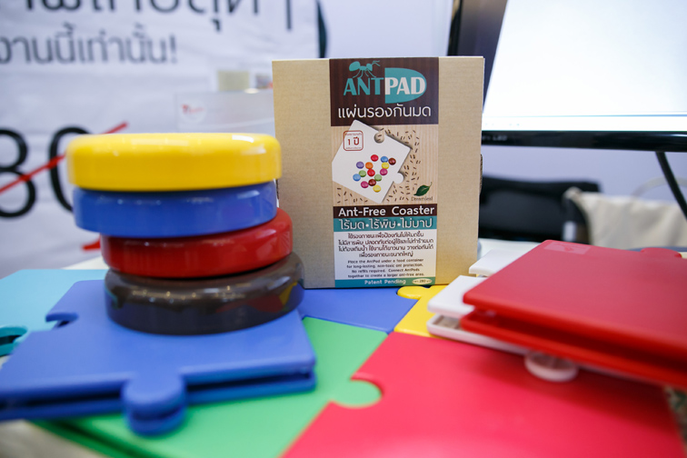 แผ่นรองกันมด AntPad ใช้แทนการหล่อน้ำใต้อาหารเพื่อกันมด เกิดจากแนวคิดการกันมดโดยไม่ต้องเบียดเบียนสัตว์ ออกแบบอย่างมีดีไซน์ด้วยแรงบันดาลใจจากตัวต่อจิกซอว์ ใช้รองใต้ภาชนะ สามารถกันมดขนาดเล็กในบ้านไม่ให้ขึ้นบนแผ่นได้ เหมาะสำหรับการทำเป็นมุมวางขนมในบ้าน รองอาหารที่ต้องวางข้างนอกเป็นเวลานาน รองถุงขนม เหยือกน้ำ แจกัน ขวดน้ำหวานที่เปิดแล้ว พิซซ่ากินเหลือ หรืออาจใช้ช่วยทำขนม เช่น วางรองคุ้กกี้เคลือบชอกโกแล็ตที่รอให้แห้ง นอกจากนี้ยังใช้รองภาชนะอื่นๆ เช่น ชามข้าวสัตว์เลี้ยงและถังขยะได้อีกด้วย สบายใจกับการได้รู้ว่า ไม่มีสารพิษใดๆ มาอยู่ใกล้กับอาหาร รูปร่างจิกซอว์ทำให้สามารถต่อแผ่นหลายสีเข้าด้วยกันเพื่อสร้างสีสันได้ตามต้องการ